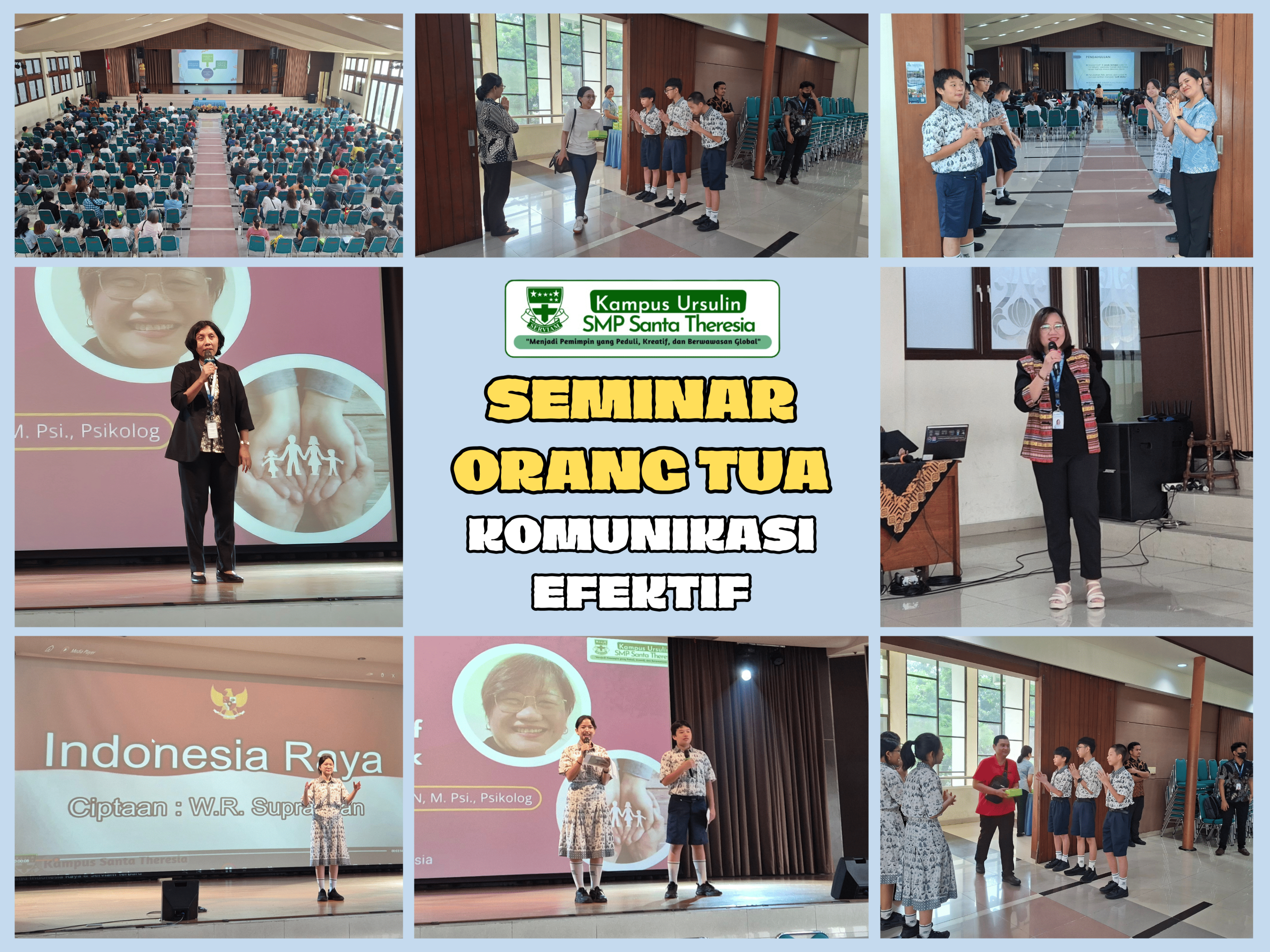 SMP Santa Theresia menyelenggarakan Seminar Orang Tua yang diadakan di Auditorium dan diikuti oleh seluruh orang tua peserta didik kelas VII, VIII, dan IX pada 20 September 2025. Kegiatan ini bertujuan untuk meningkatkan pemahaman orang tua mengenai komunikasi yang efektif dengan anak, sehingga mendukung perkembangan peserta didik di rumah maupun di sekolah.